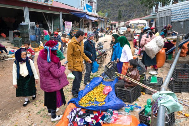 The market usually meets on Sunday mornings of the week. From early in the morning, every stream of people crowded the streets of the town. Many people from remote villages have to get up at midnight and cross steep passes to reach Yen Minh. The quiet space here suddenly comes to life in a market day, with all colours of costumes: the brocade dress of the Mong people, the red scarf of the Dao people, the blue skirt of Tay girls, indigo costumes of the people. Nung…